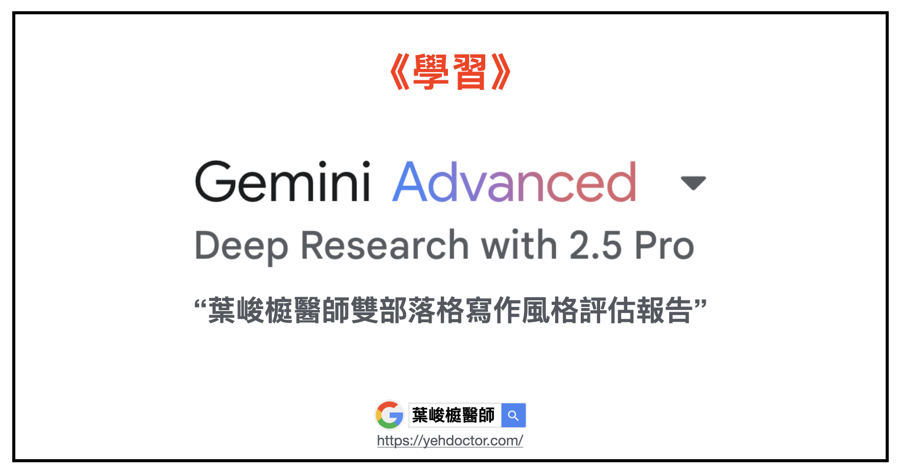 《學習》葉峻榳醫師雙部落格寫作風格評估報告 by Google Gemini Advanced Deep Research。