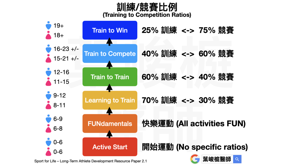 成長每個階段,運動的『訓練/競賽比例』都不一樣,隨著成長發育,應循序漸進地拉高競賽佔比。