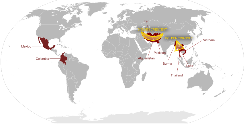 金新月:中東的阿富汗、伊朗、巴基斯坦邊境,盛產大麻和罌粟花。