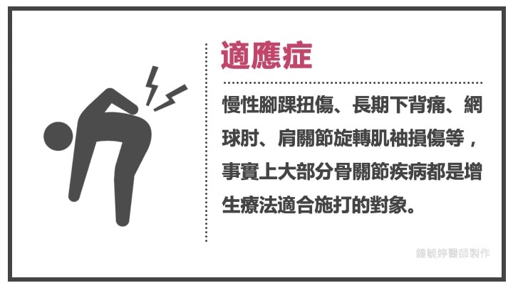 增生療法,最近幾年相當火紅,英文叫做「Prolotherapy」,光看字面,可能不太清楚什麼意思。成大醫院復健科,鐘毓婷主治醫師,同時也是運動醫學專科醫師、增生療法專家 ; 她製作了懶人包,讓我們來瞧瞧增生療法是什麼?